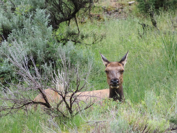We landed at Bozeman airport (in Belgrade MT) late in the day. The next day we cycled to Bozeman to stock up with fuel and food and then headed to the start of the Trail Creek rd. To reach this road we needed to cycle a small section on the interstate 191. But we reached the Trail Creek rd quickly and started cycling towards Pine Creek. The first few days it's raining, but after that we only had nice weather on our cycling trip. We slowly climbed to the entrance of Yellowstone national Park and our first night there at Mammoth Hot Springs. At the Mammoth Hot Springs campground there were a lot of elk.