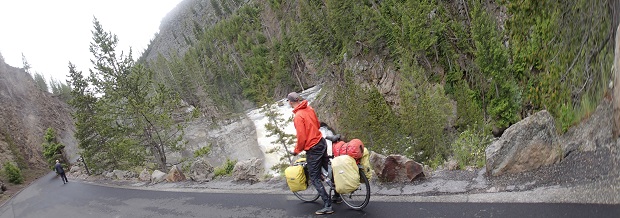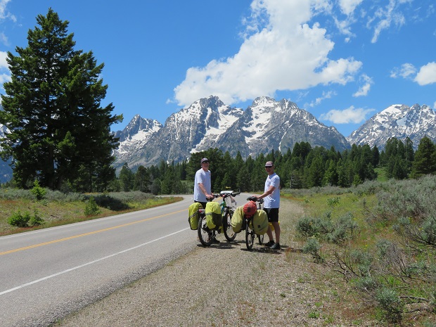 Via the John D. Rockefeller Jr. Memorial Parkway (with a cold downhill through the clouds) we cycle into Grand Teton national Park. Here we camp at the Jenny Lake campground. After Jenny Lake there is a very nice multi-use path towards Moose. A small road leads us to Teton Village. Also from Teton Village we can cycle on a multi-use path, away from traffic, all the way to Wilson. At Wilson we take the Valley road along the Snake river towards highway 36. This highway we follow to Alpine.